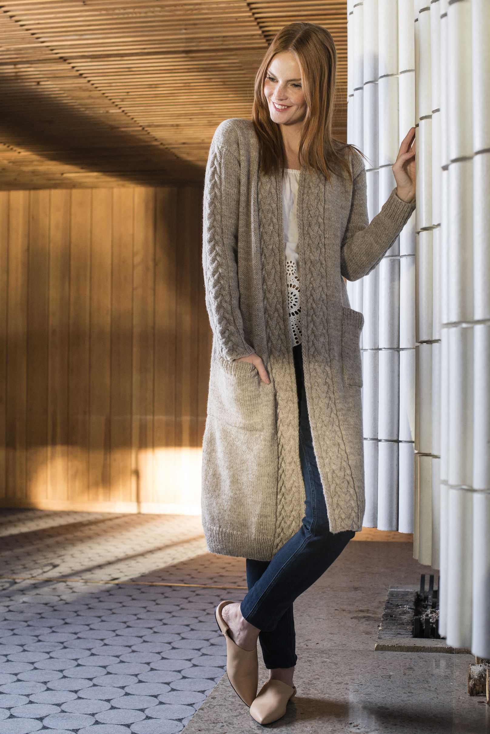 - Кардиган Лало. В его основе — красивый узор из кос, причем очень крупных. Главная изюминка — плавные переходы совместимых оттенков. При работе спицами для кардигана этого типа рекомендуется взять пряжу «Ланаголд 800» не менее трех тонов. Подойдет инструмент № 5. Работу начинают сразу в три нити. Через несколько раппортов одну из них удаляют и присоединяют следующий оттенок. Спустя несколько сантиметров меняют вторую нить. Через такое же количество рядов первый оттенок полностью меняют на второй. Стоит учесть, что такие кардиганы для полных женщин — не лучший выбор. Объем, создаваемый большими косами, плохо скрывает недостатки фигуры, визуально увеличивая ее. А вот на стройных девушках модель смотрится очень красиво.