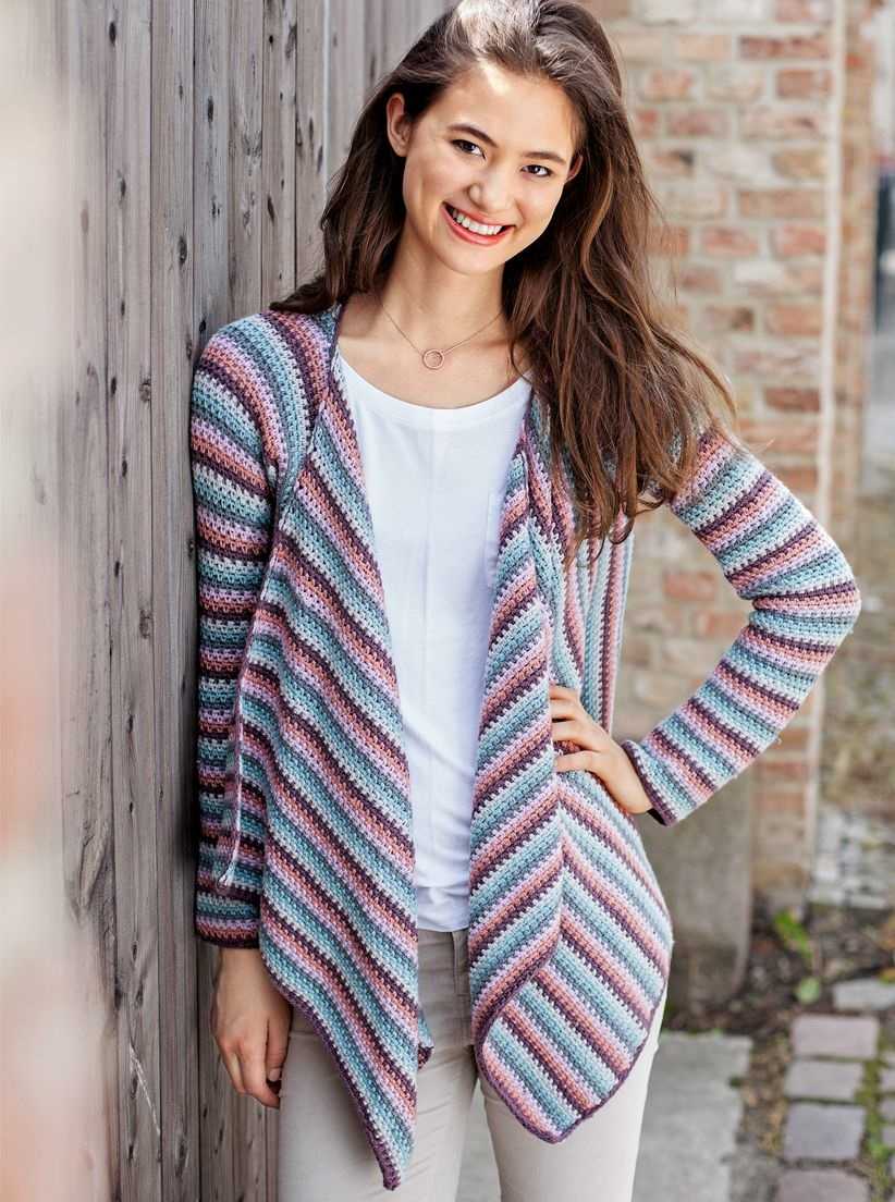 Также не требует серьезных навыков– достаточно освоить азы вязания крючком и внимательно считать петли. Изделие получается женственным, его можно сделать запашным, добившись облегания по фигуре, или более свободным, чтобы оно красиво драпировалось и выглядело легким и летящим. Проймы можно обвязать, чтобы получилось изделие с длинным рукавом, ¾ или ⅞ — на усмотрение мастерицы. Однотонный вариант в сочетании с плотной вязкой столбиками без накида или в варианте «Столбик с накидом-столбик без накида» получится мягким и теплым, ажурный вариант добавит образу легкости и изящества, хорошо дополнив классическую юбку-карандаш или облегающие джинсы. В качестве завязок можно использовать атласные ленты соответствующего оттенка или украсить кардиган одной-двумя пуговицами необычной формы.
