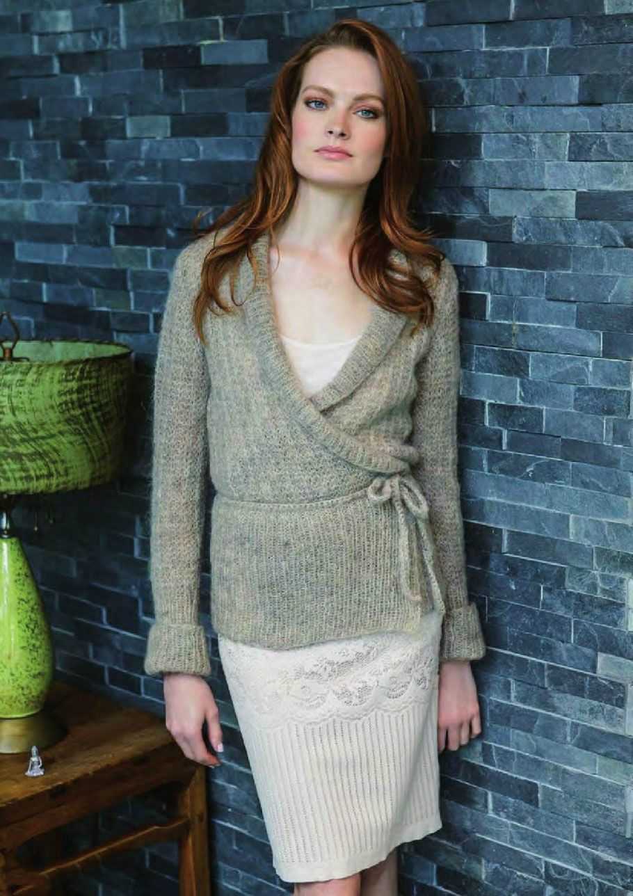- Кардиган с запахом спицами. Это отличный способ скорректировать линии талии и бедер. Изделие выполняется без застежек под пояс или может закрепляться на одну–две пуговицы. Одна половина изделия заходит на другую, запахивается. Длина и узор могут быть разными. Для кардигана подойдут нити любой толщины. Для теплого времени года лучше выполнять вязание из тонкой пряжи.