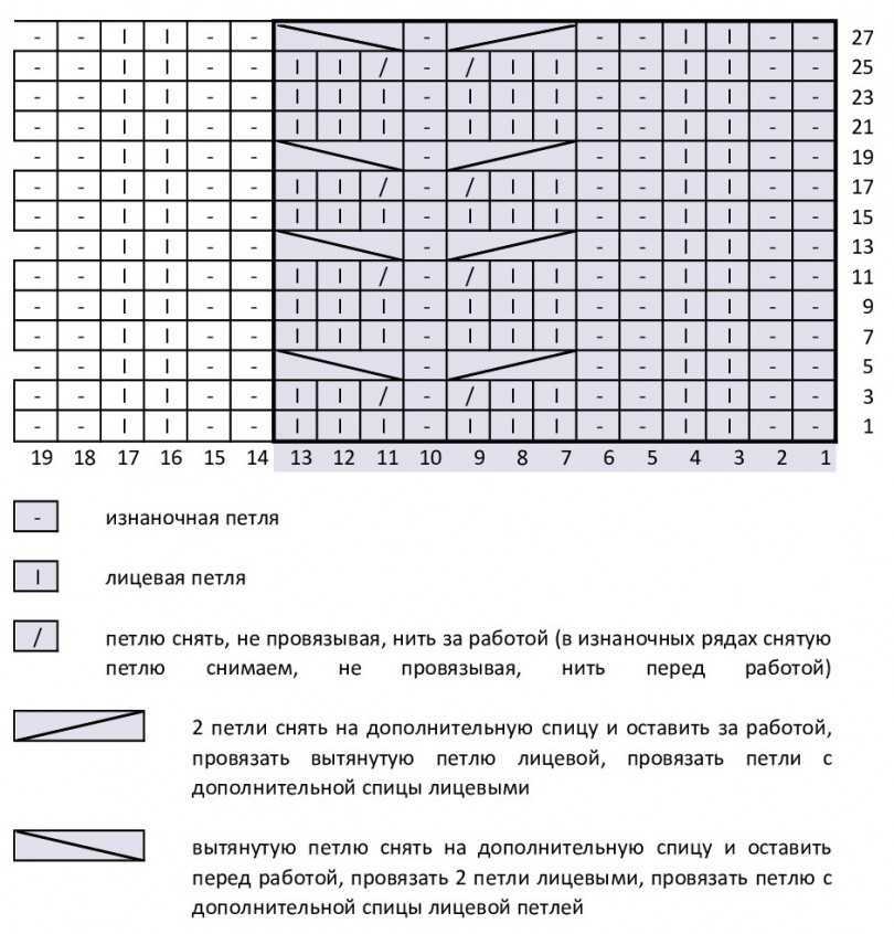 - 11, 15, 19 РЯДЫ: 1 лиц. скрещенная петля; 2 изн.; 3 лиц.; 2 лицевые петли вместе с наклоном ВЛЕВО; накид; 3 лиц.; 2 изн.; 1 лиц. скрещенная петля.