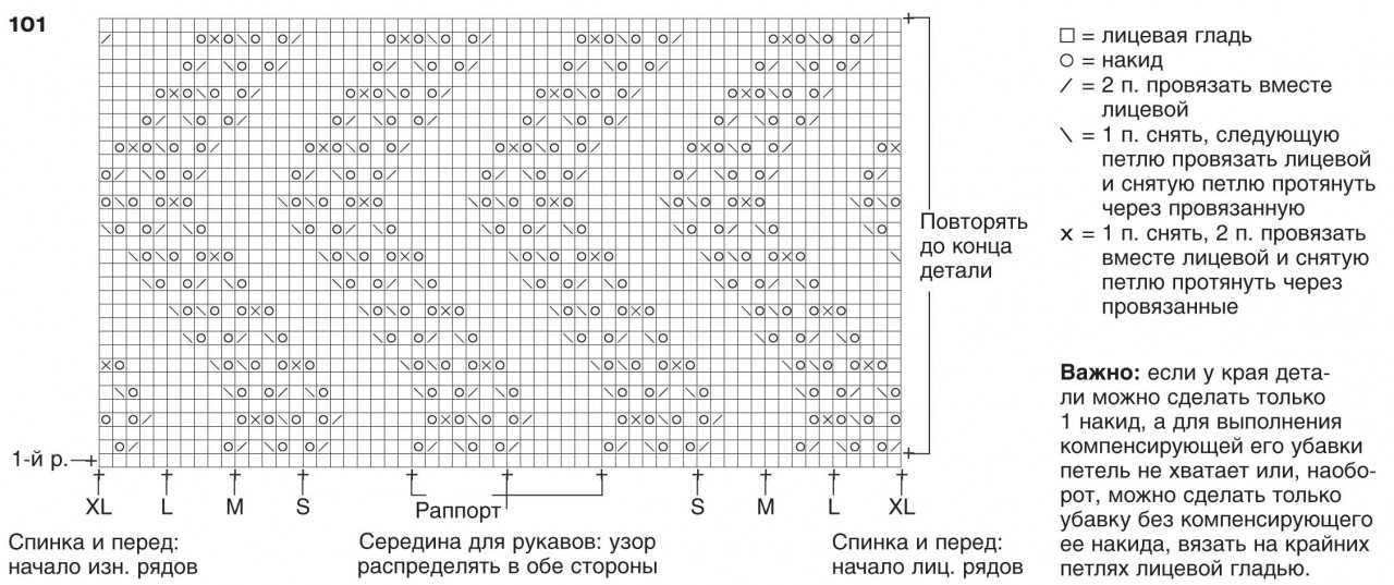 Ниже представлена схема на фото, с дальнейшим подробным описанием. Вертикальная черточка, это лицевая петля (ЛП) в лицевом Р, и изнаночная петля (ИП) в изнаночном Р. Горизонтальная черта имеет противоположное значение. Черный круг, это накид, а стрелка вниз, это 3 петли вместе с перестановкой.