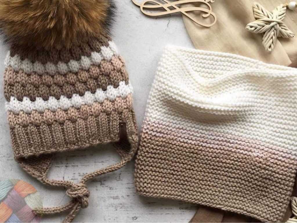 Этот вид шапки и снуда может быть разной высоты. От этого зависит количество петель. Для 20 см можно набрать 50-55 петель. Шапка для девочки спицами вяжется поперечными рядам в ширину: