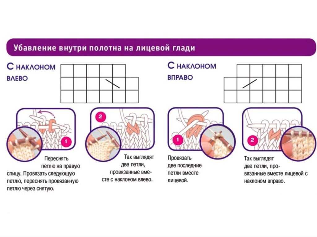 - треугольник, смотрящий влево — две петли провязать вместе лицевой за переднию стенку;