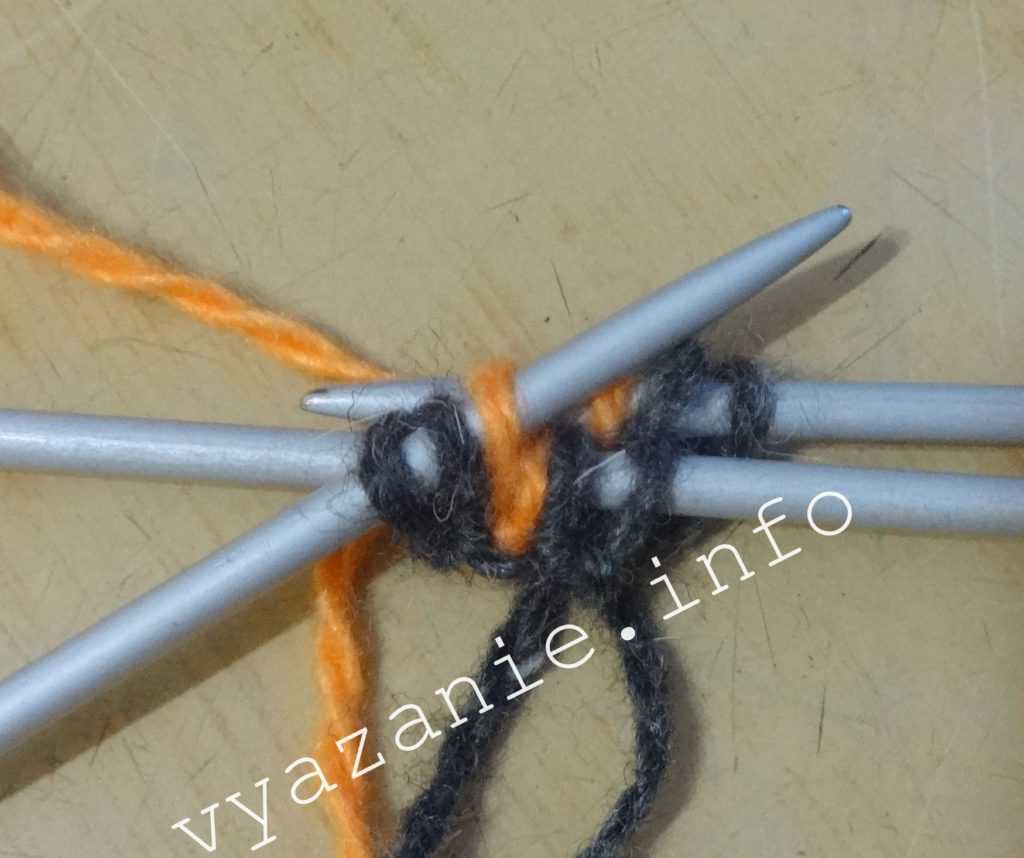 На 2 сложенные вместе спицы набираем 6 петель: 2 серые, 2 оранжевые, 2 серые.
