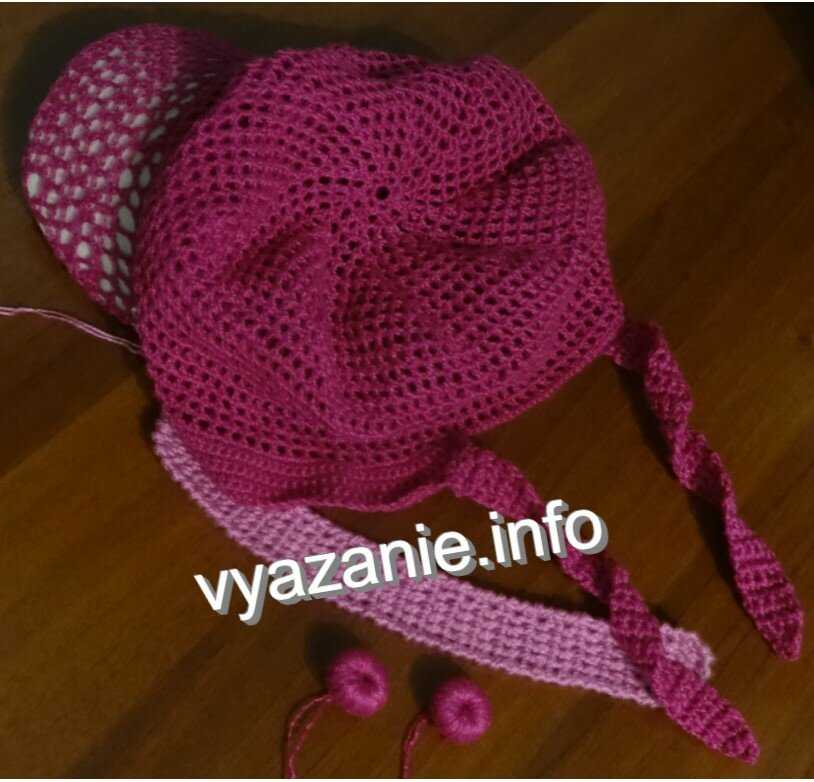 Теперь вяжем столбиками без накида низ кепки. У меня будет отверстие для хвоста, его обыграю завязками. Можно обвязать полностью по кругу, в последний ряд ввязать или даже крайний ряд связать . Всего у меня будет 6 рядов столбиков без накида. Вы можете связать шире или уже.