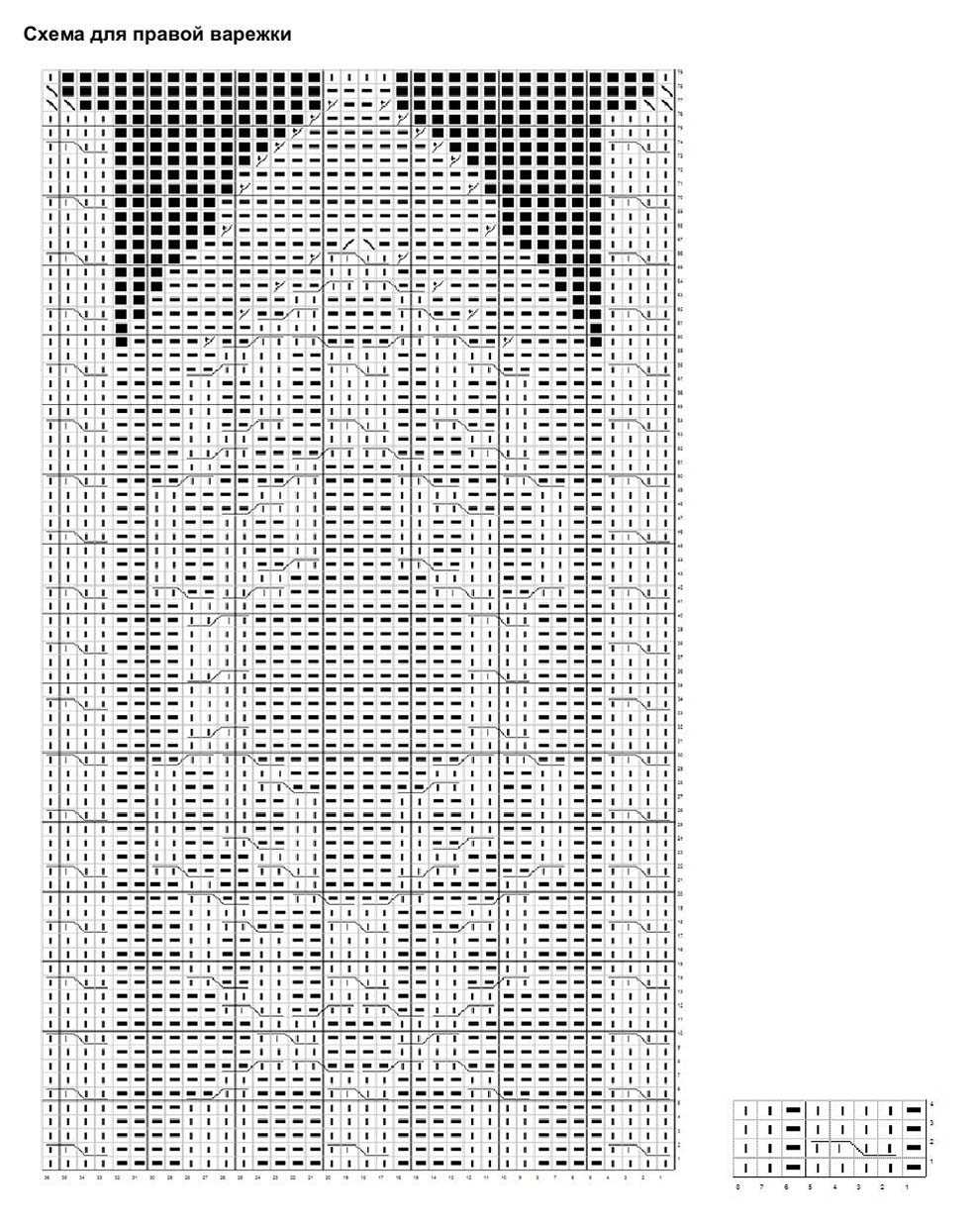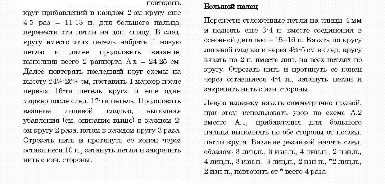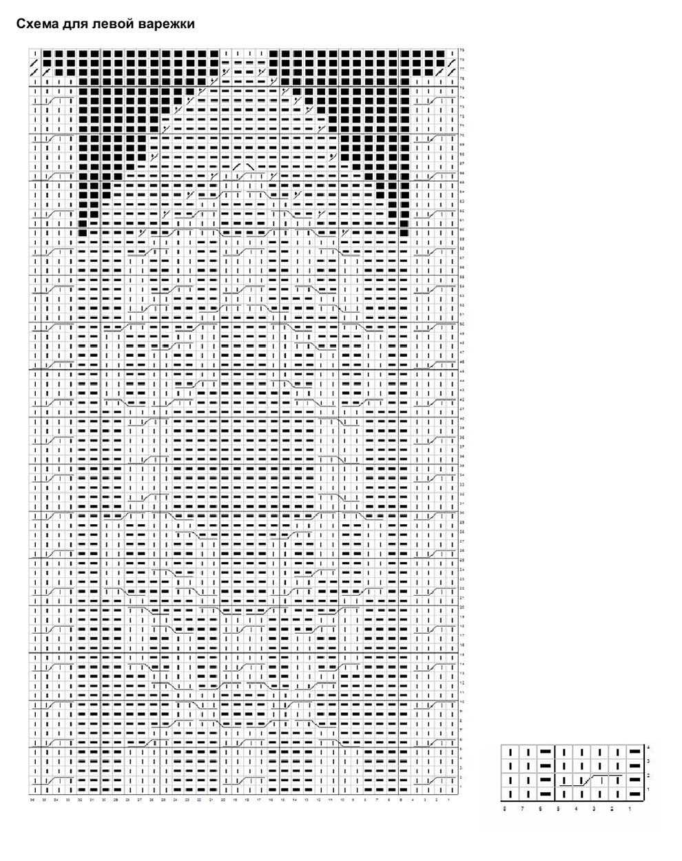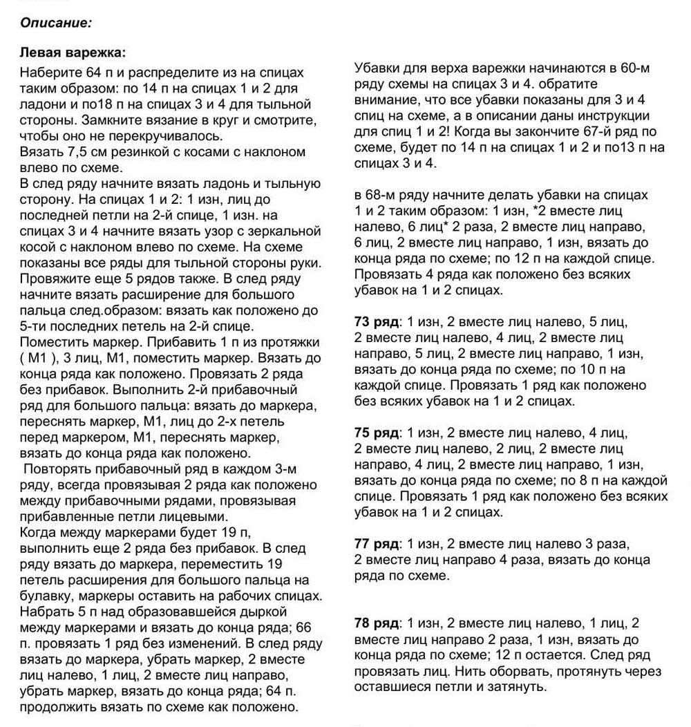 Правую варежку выполнять как левую, только запястье вязать по схеме кос с наклоном вправо и тыльную сторону – по схеме зеркальной косы с наклоном вправо.
