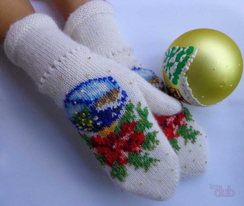 К Новому году успейте связать на 4 спицах нарядные праздничные варежки с цветочным принтом.
