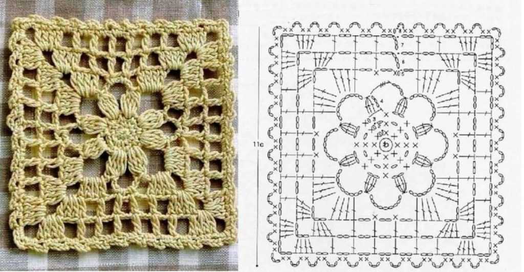 В центре мотива располагаются различные цветки. Сложность выполнения такого мотива зависит от вида выбранного вида цветка и его формы – объемный или плоский. Объемный вяжут в несколько рядов с использованием нитей разных цветов, что увеличивает время работы.
