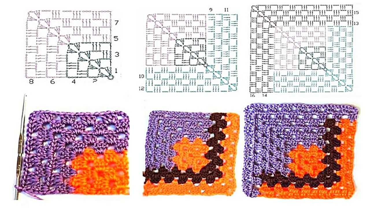Далее та же схема, но другим цветом. Потом обвязка с другой стороны. При желании чередуют обвязку с разных сторон, меняя цвета. Удобство – можно не соединять элементы, а создавать единое полотно постепенно, довязывая ряды с разных сторон. Получаются красивые вещи.