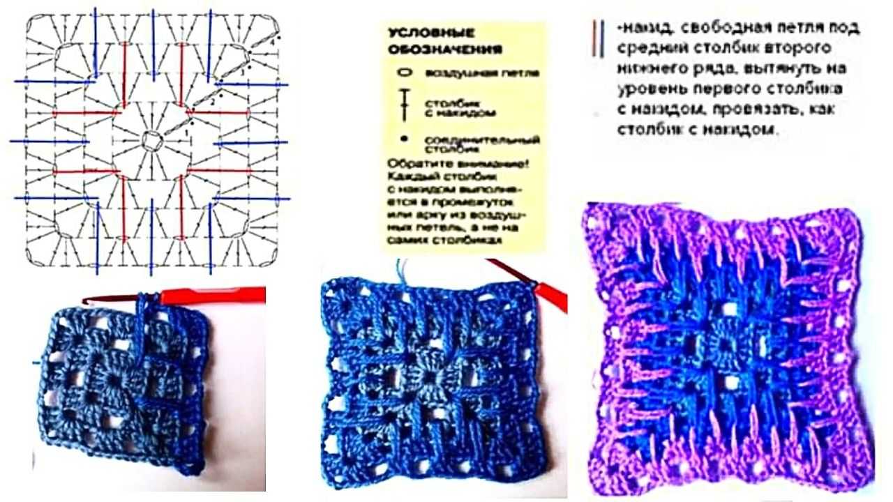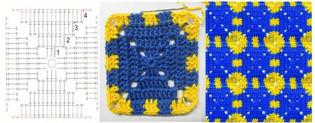 У начинающих мастериц могут возникнуть сложности при выполнении, поэтому им больше подойдет простой вариант – в однотонном элементе вводится контрастный цвет в углах, который создает красивый рисунок при соединении нескольких элементов.