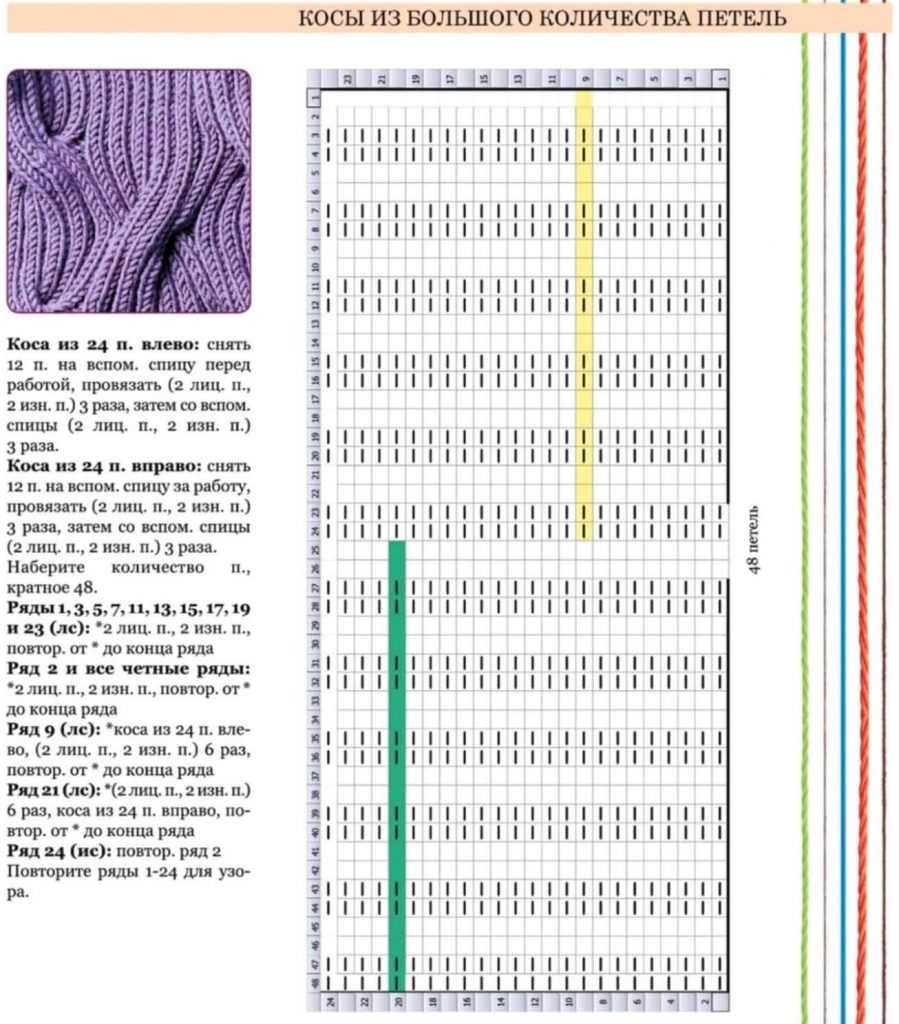 Вот этот рисунок тоже хорош для шарфа или снуда, отличие от нашей первой схемы – косы немного уже (не 4, а 3 п.). Вязать по рисунку – значит, если спицы круговые – чётные р. – лицевыми, а если спицы простые, чётный р. – изн!