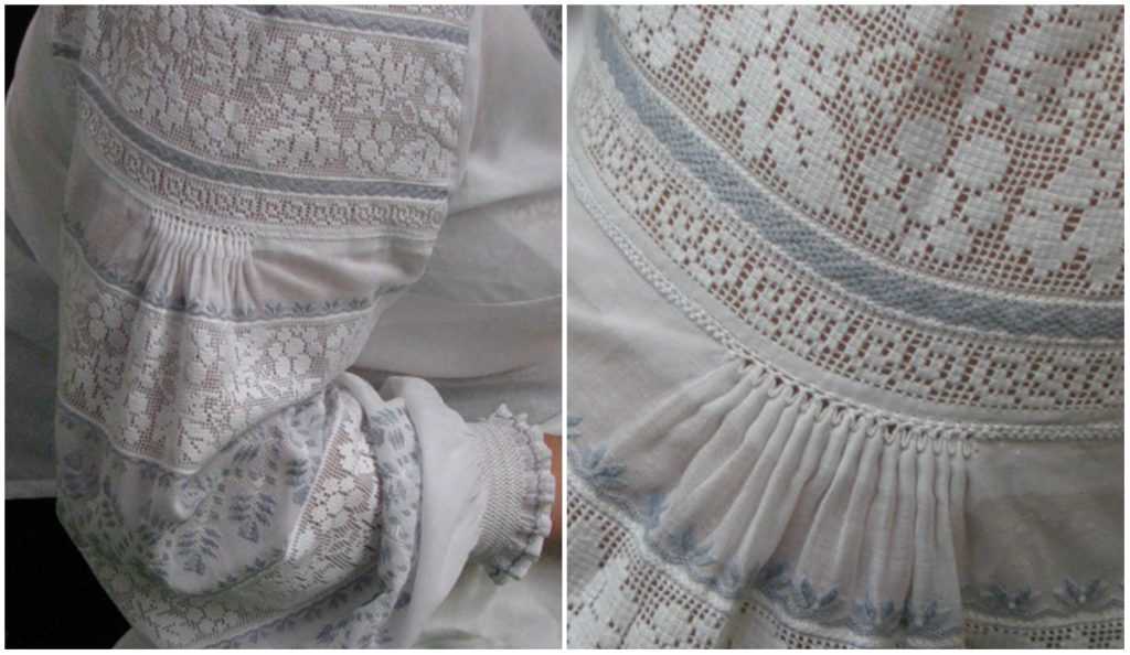 Белая строчка на изделии смотрится изысканно, привлекательно. В основе лежит применение разреженной, слегка просвечивающей ткани. Наличие плотного белоснежного сюжета на вещи показывало статус, высокий уровень дохода семьи.