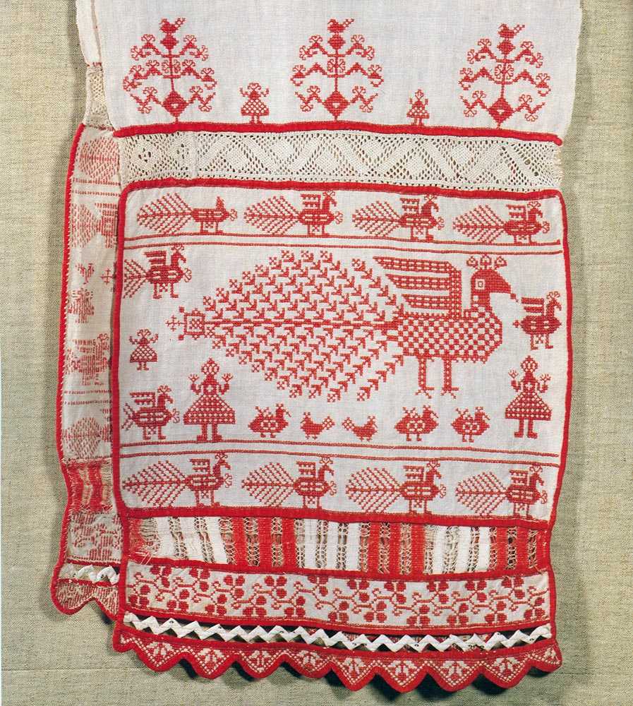 семейное древо. По традиции невеста в процессе подготовки приданого вышивала на одном конце свадебного рушника свое родословное древо, оставляя другой конец пустым. После сговора (помолвки) заполнялся и второй конец полотенца – там красовалось родословное древо жениха.