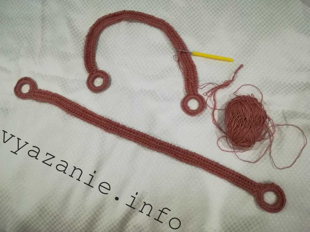 Дальше вяжем ручки. Начинаем с кольца. Обвязываем одно кольцо, вяжем ручку, потом обвязываем второе кольцо. Также вяжем вторую ручку.