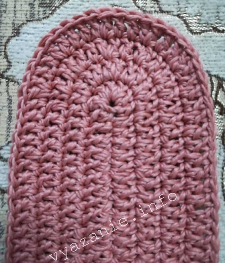 Сначала набираем в две нити цепочку из воздушных петель и обвязываем её с двух сторон столбиками без накида. В местах разворота вяжем по 5 столбиков в одну петлю. Похоже на то, как вязать подошву у пинеток.