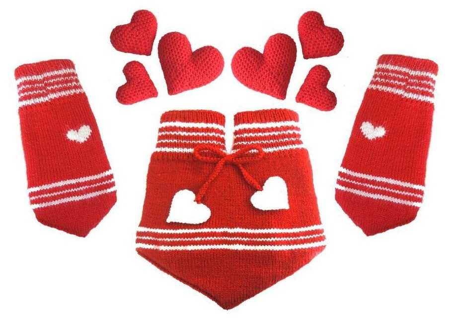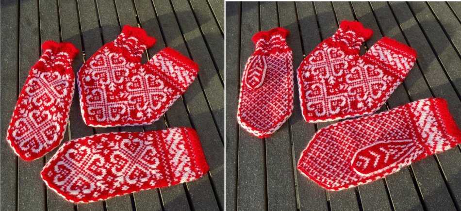 фото готового набора варежек для влюбленных, выполненных спицами, вариант 10![]()