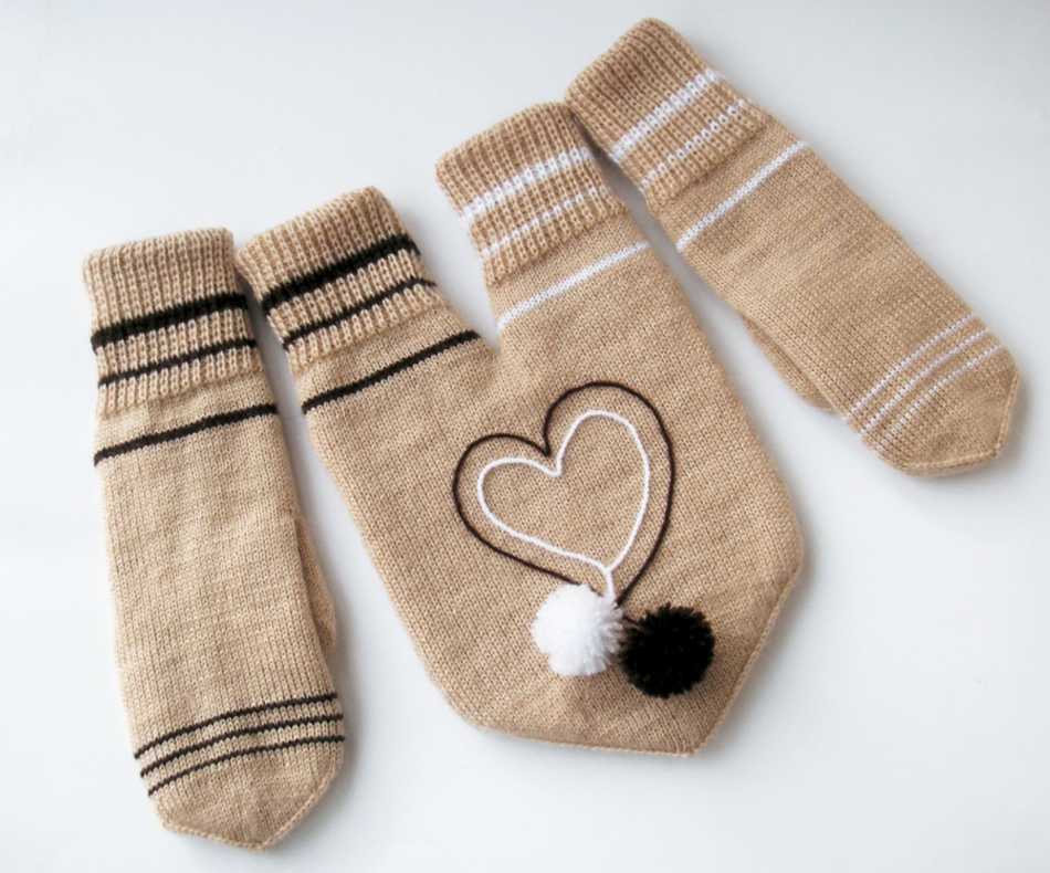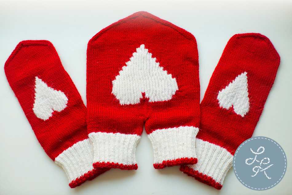 фото готового набора варежек для влюбленных, выполненных спицами, вариант 9