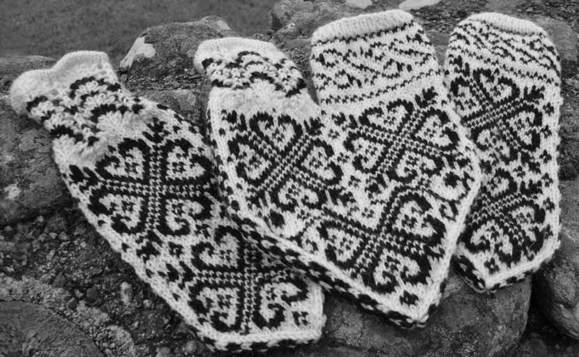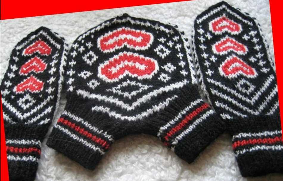 фото готового набора варежек для влюбленных, выполненных спицами, вариант 6![]()