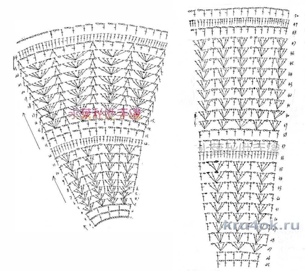 Следующая модель, пожалуй, самая модная. Здесь и рельефные столбики, и веерочки. Очень эффектный узор. Описания нет, но опытным мастерицам можно разобраться и по схемам.
