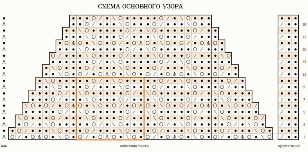 Всегда провязываются лицевыми три первые и три последние петли ряда. Серединная петля помечается булавкой/маркером. Выполняем: накиды – изнаночными, петли – согласно рисунку — в четных рядах.