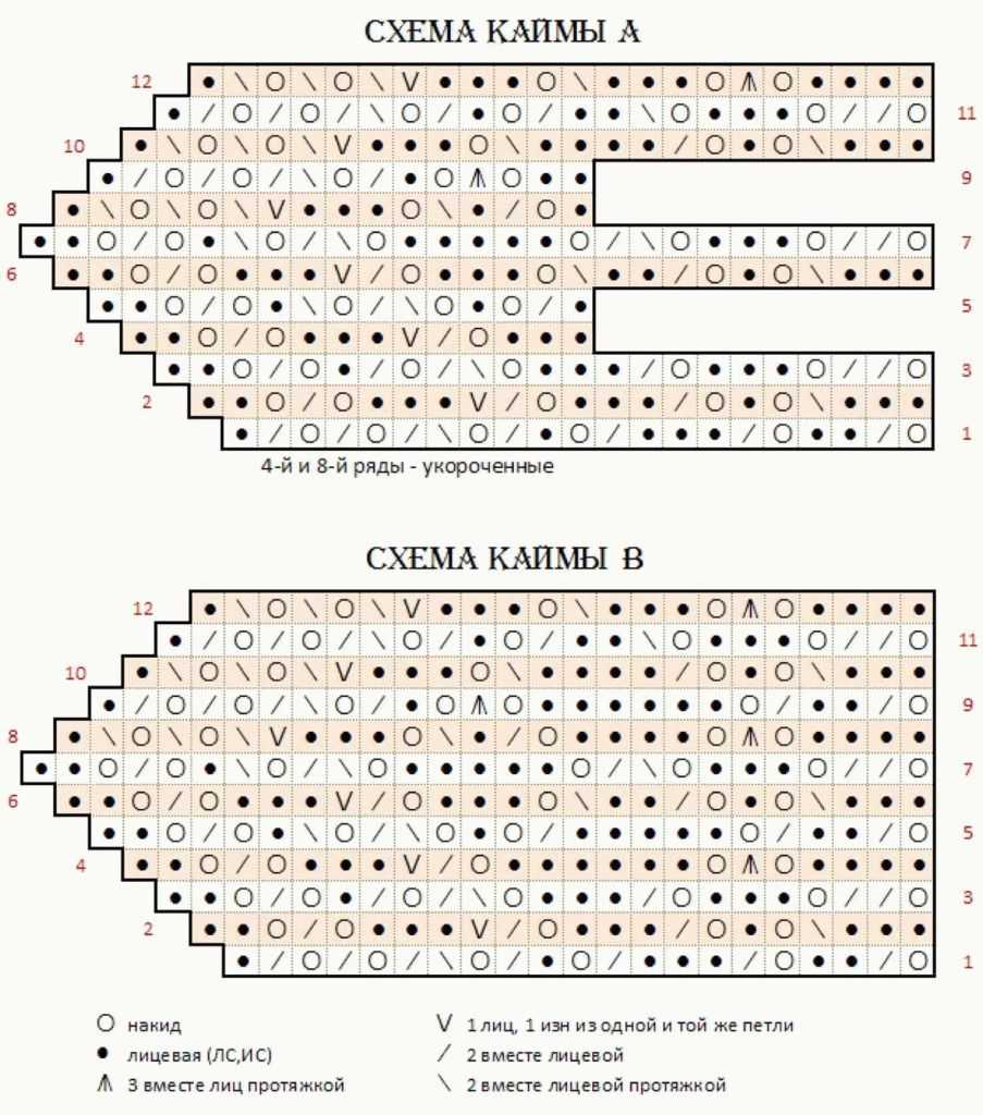 Важный аспект: технология создания кромочных петель остается неизменной – по 3 платочной вязкой на протяжении всего периода работ. На схеме В кромочные уже указаны.