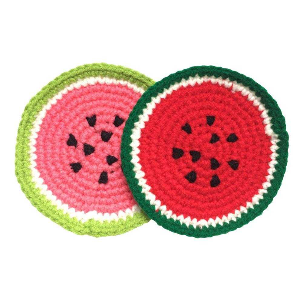 - Актуальным вариантом станет изготовление подставки в виде кусочка фрукта. Если заранее связать круг из ниток нужного цвета, то с помощью элементарной вышивки легко сделать украшение. Таким образом, можно воссоздать ломтик лимона, апельсина, киви, арбуза.