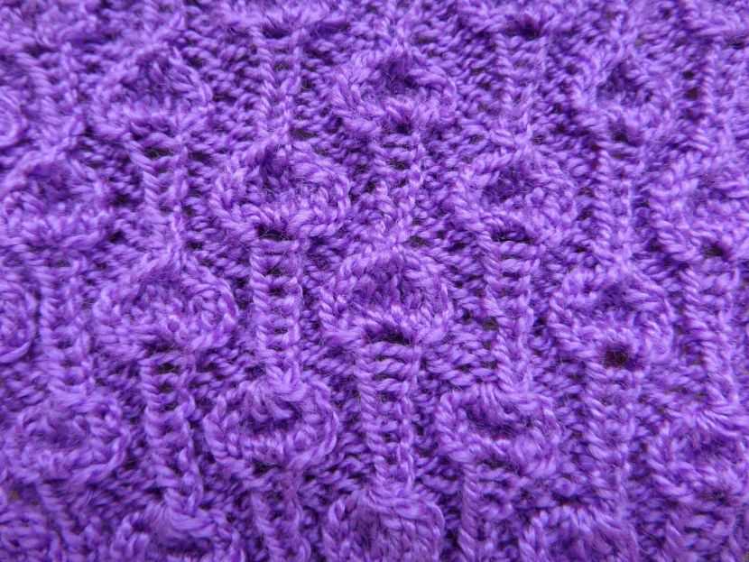 В пятом ряду три петли провязываются в обратном порядке: сначала третья за переднюю стенку, затем вторая за заднюю, затем первая снова за переднюю. На глади получается три перекрёстных петли. Дальше рисунок повторяется. Бугорки располагают не только рядами,но и в шахматном порядке. Их используют для отделки: манжет, планки.