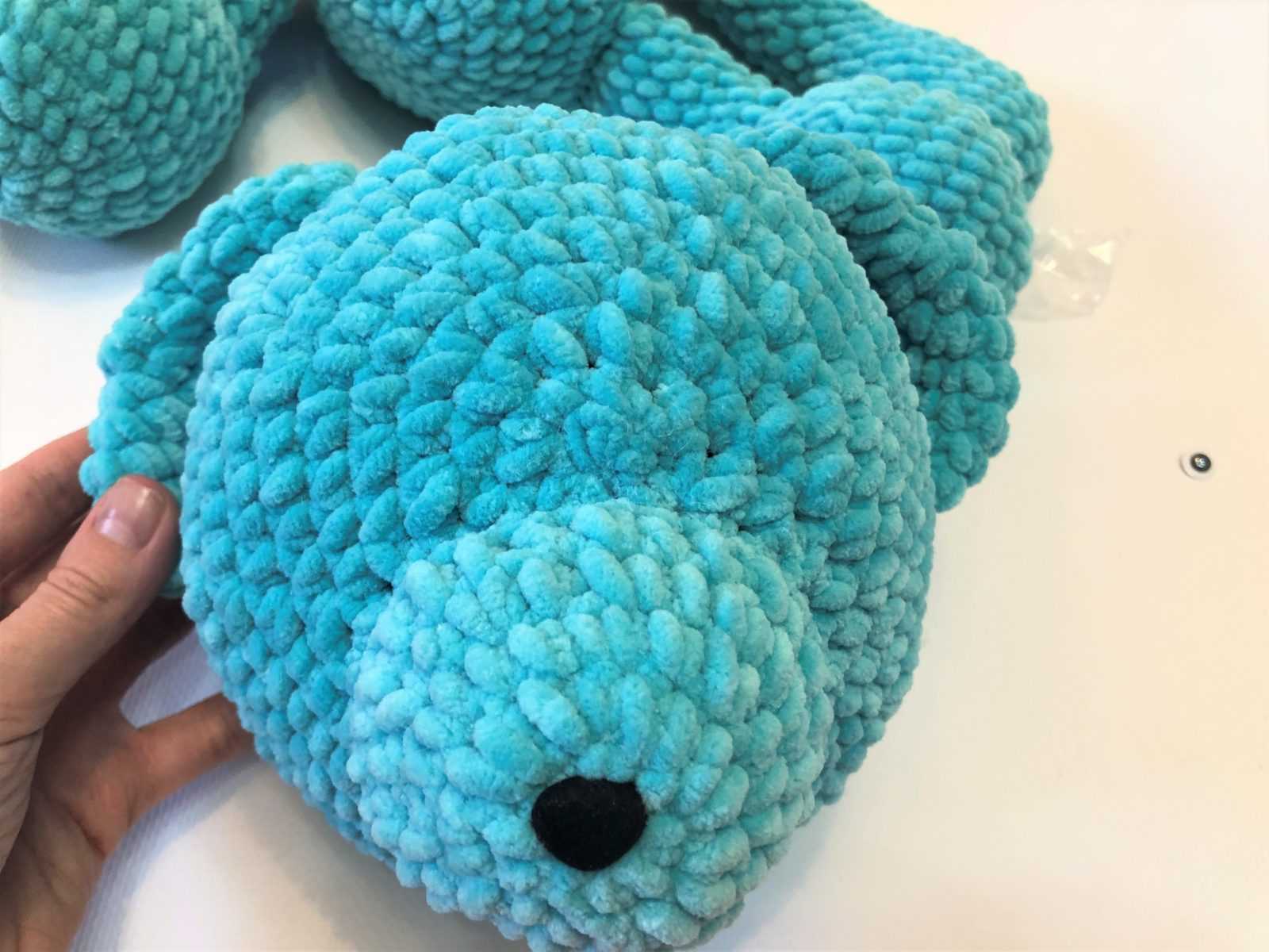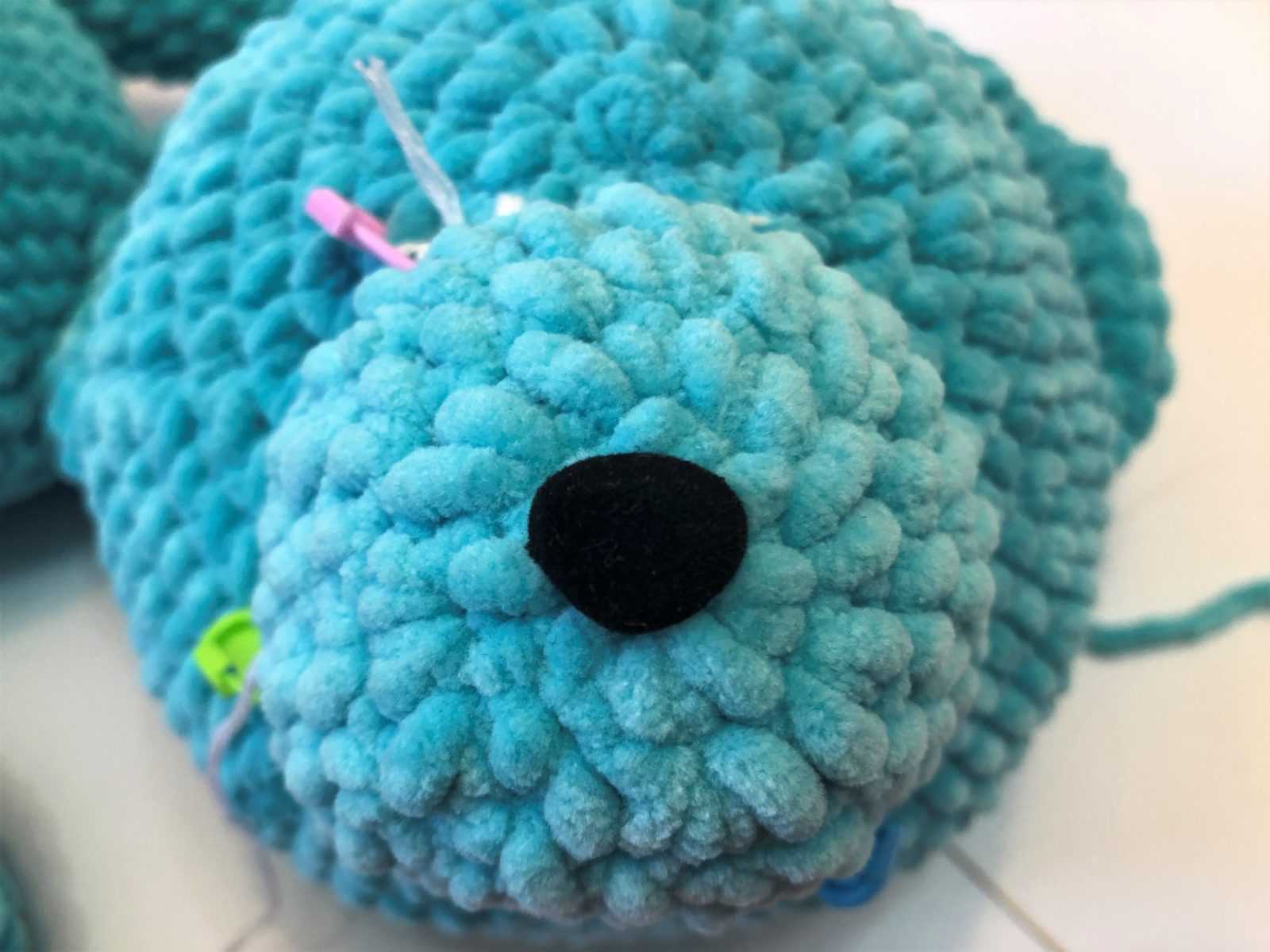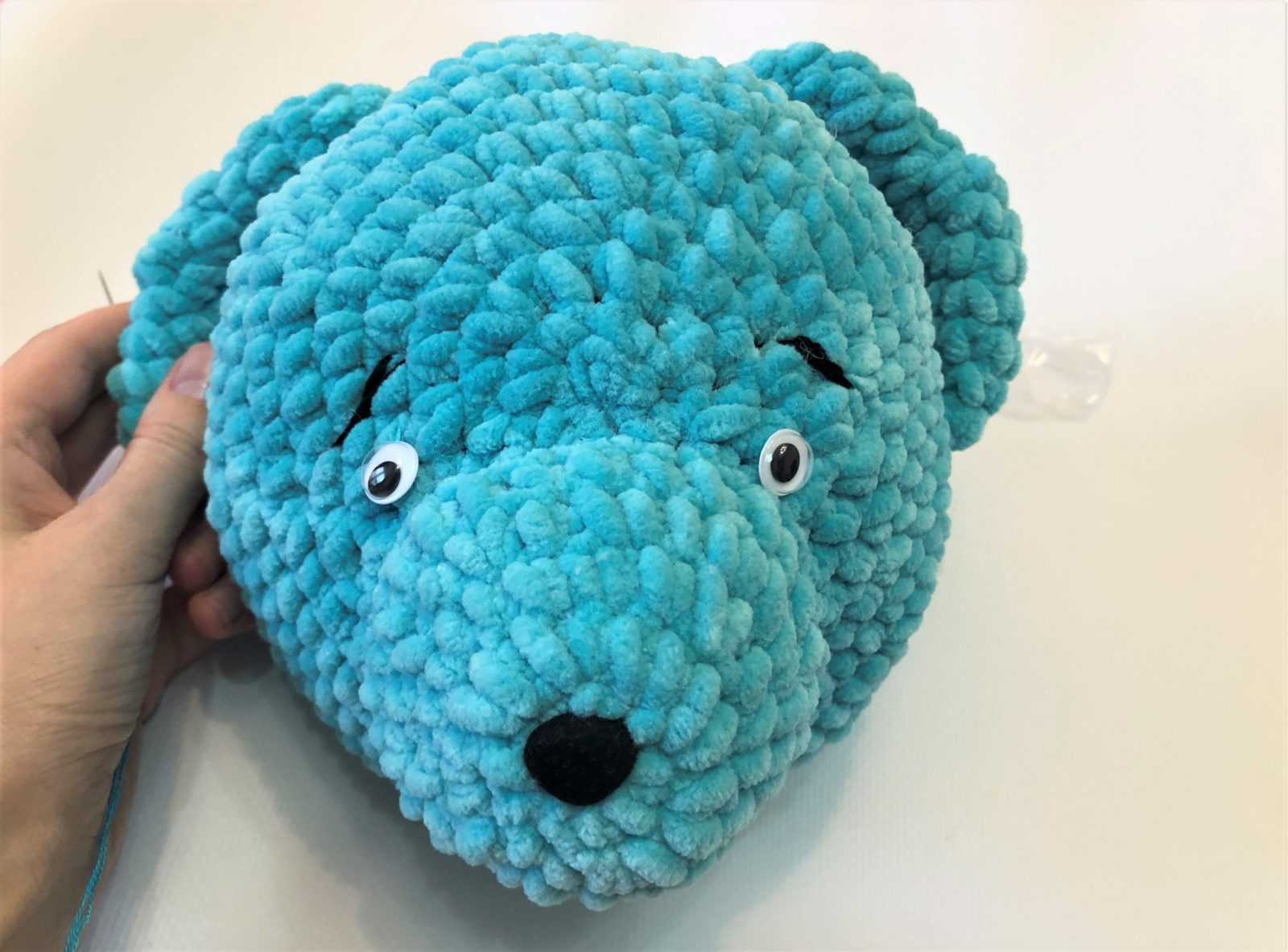 Удобно закрепив все кончики с изнанки, заполняем мордочку и закрываем последний ряд на затылке.