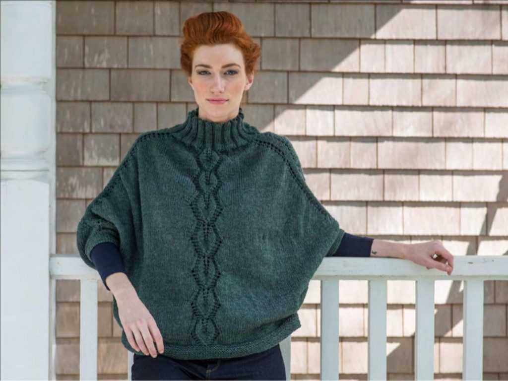 Учитывайте, что модель разработана нечетко по окружности бёдер, а имеет погрешность 10’, то есть 24 см. То есть нижний край не должен быть в обтяжку. Высота пончо – 65,5 (66, 70, 71, 75, 77,5) см. Пряжа Berroco Ultra Wool (100% шерсть 100 гр./200 м. Понадобится 5 (6,6,7,8,9) мотков, цвет Rosemary.