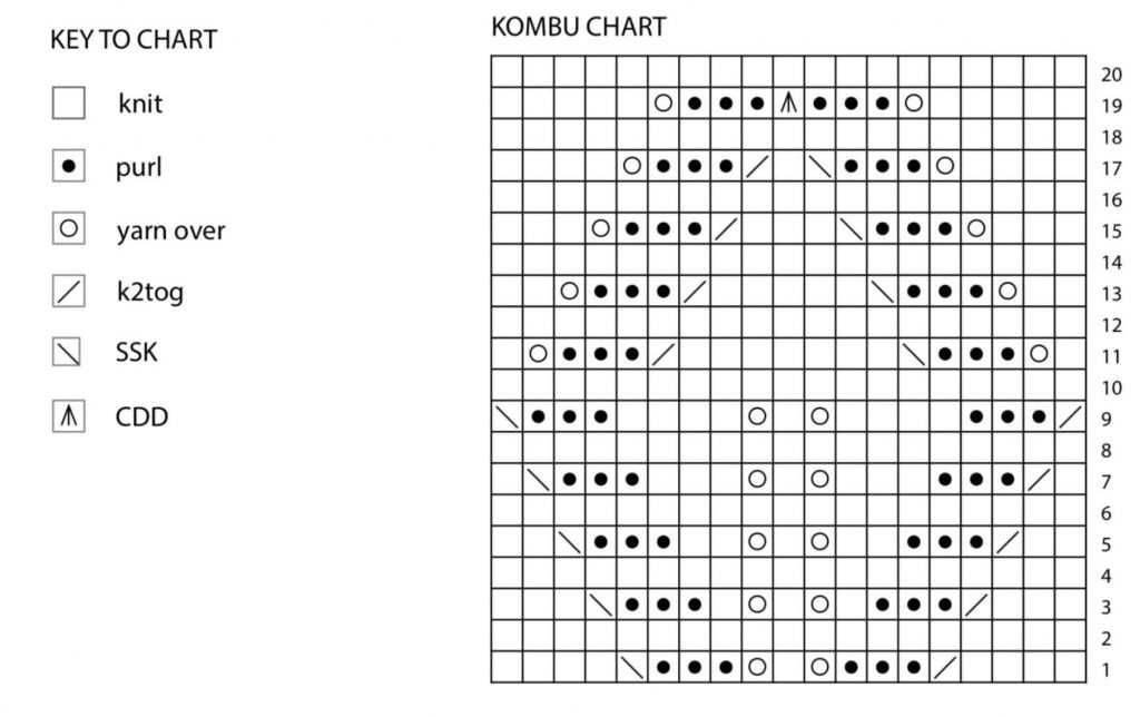 Ряд с убавками: *1 лиц, CDD (протяжка, см. условные обозначения), лицевыми до узора “листья”, 19 п. узора, лиц. не доходя до следующего маркера 4 п. – CDD протяжка, 1 лиц, маркер* повторить от * до *. То есть мы в каждом 2-ом р. убавляем вкруг по 8 п, кроме последнего р. Итого – убавок 24 раза по 8 п.