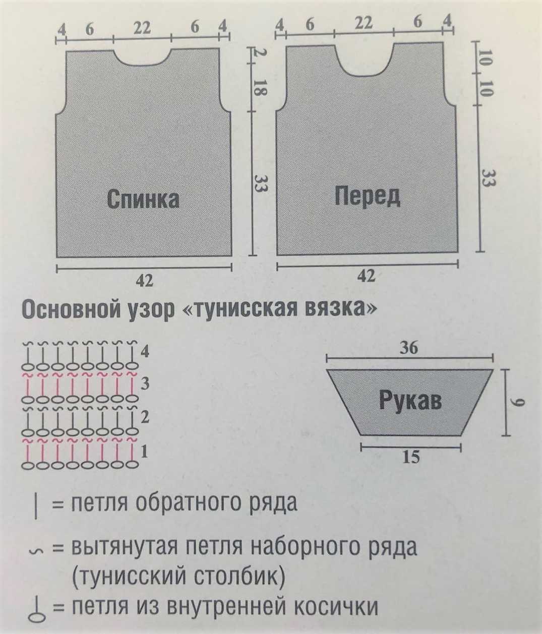 Спинка: крючком № 3 набрать цепочку из 64 в. п. (63 в. п. основы + 1 в. п. подъёма) и вязать 37 р. основным узором «тунисская вязка». Для оформления линии пройм в 38-м р. закрыть с обеих сторон 2 раза по 2 п., 3 раза по 1 п. В работе находится 50 п. Далее вязать 9 р. основным узором «тунисская вязка». Для оформления линии горловины в 17-м р. от линии проймы полотно разделить на две равные части. В 18-м р. от линии проймы оставить непровязанными 10 п., в 19-м ряду – 7 п. В работе 15 р. В 20-м ряду от начала пройм все петли закрыть в одном ряду.