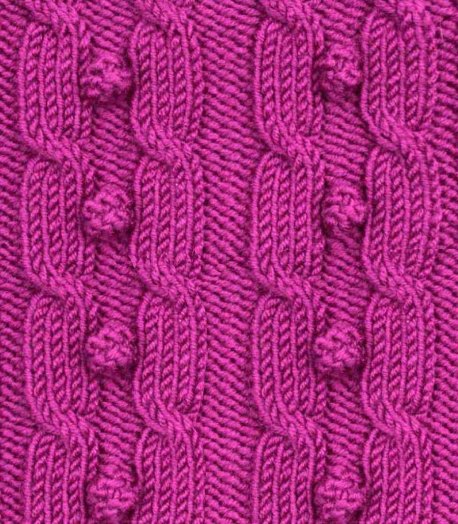 Узор хорошо выглядит на фоне изнаночных петель, поэтому вяжите слева и справа раппорта несколько изнаночных петель. На образце, представленном на фото связано по изнаночных 10 петель.