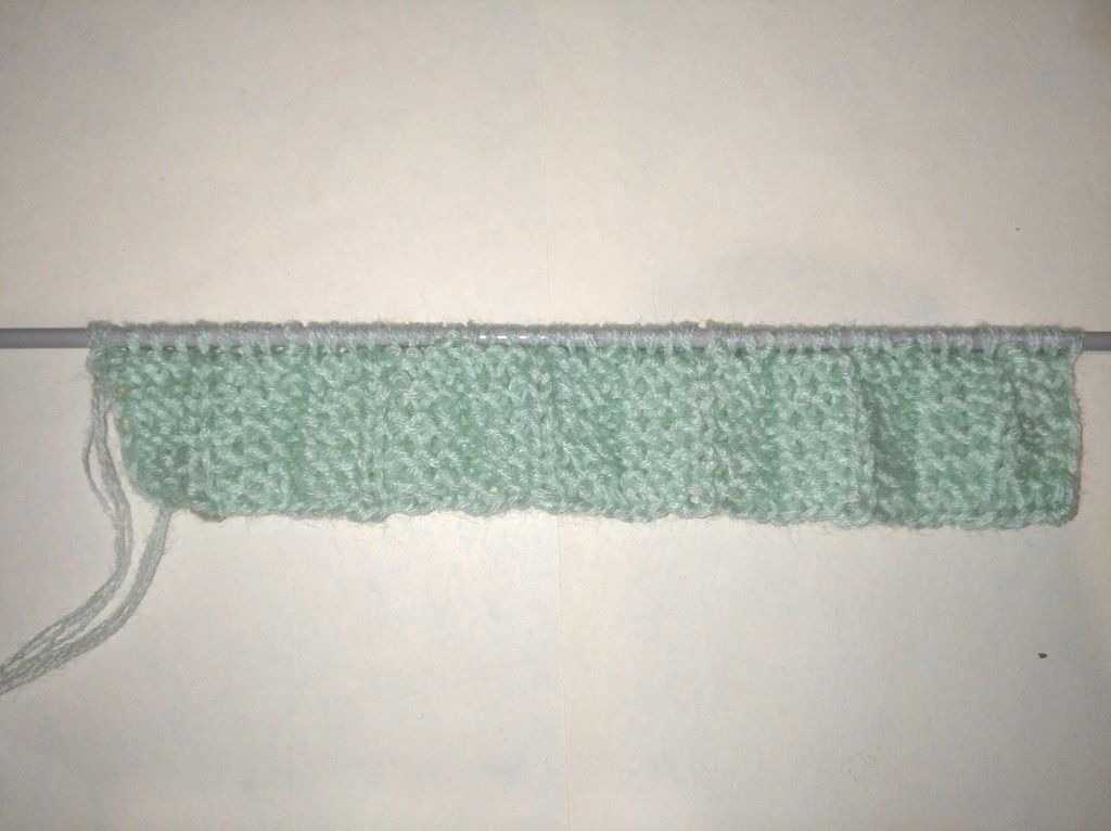 Когда будет готово около 10 рядов, начнет вырисовываться узор. На полотне четко проявятся верхние точки и «впадины» — вся основа станет в складку. Достоинство такого узора в том, что он двусторонний.