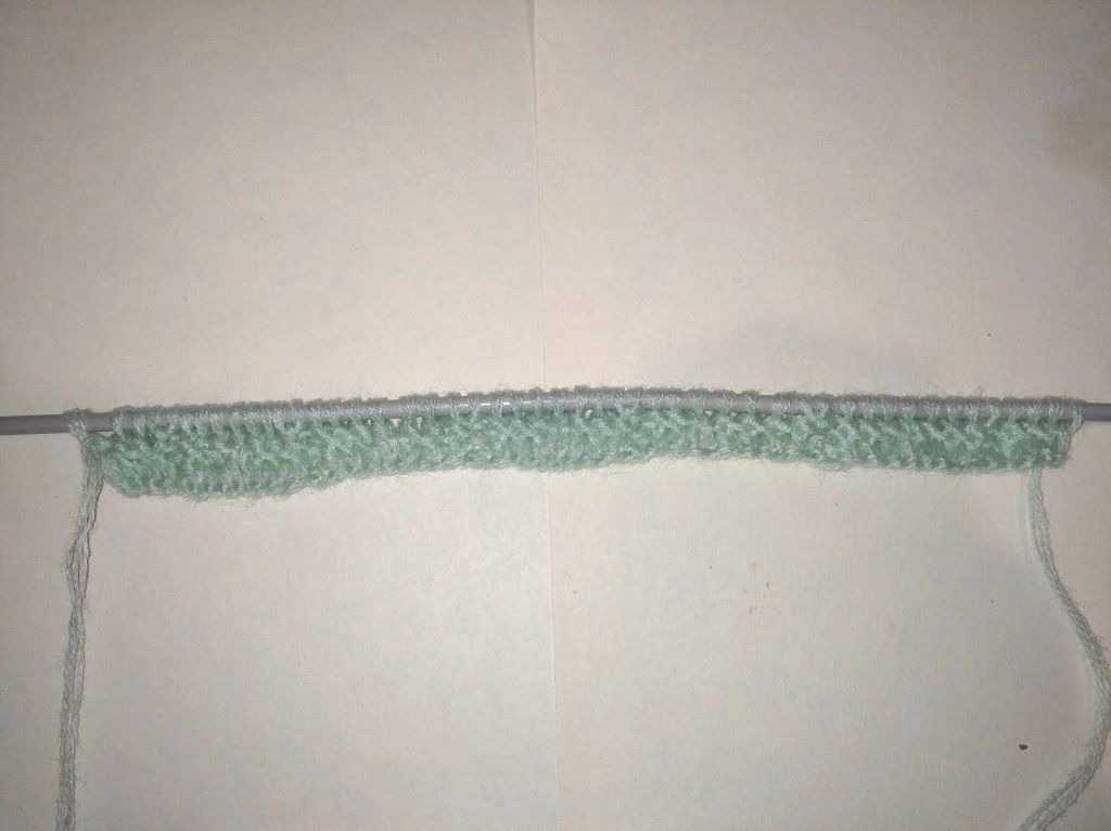 - Когда провязано 7 см резинки основным цветом, провяжите 1 ряд лицевыми петлями пряжей голубого цвета и 1 ряд изнанкой