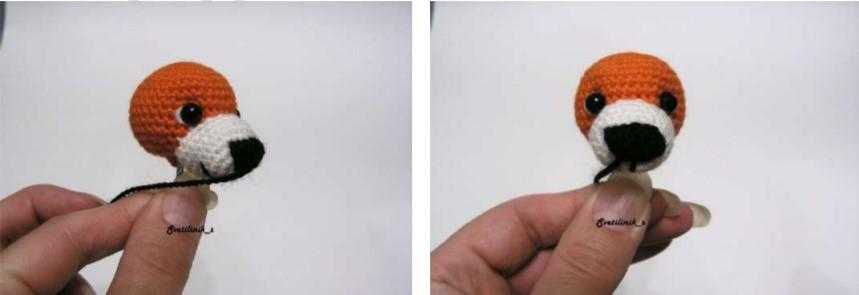 - Заполнить нос черной нитью, не обрезая, сделать стежок вниз по центру и в длину 4 ряда.