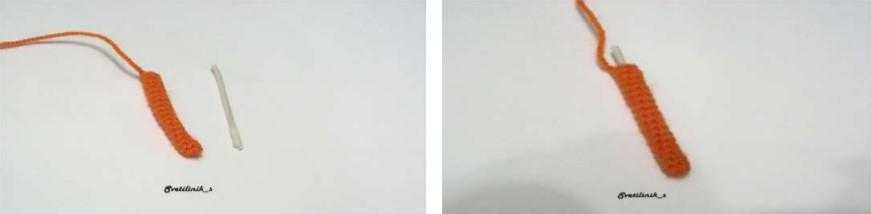 - Набивка лапок тигренка крючком по схеме и рекомендациям должна быть умеренной, по мере выполнения работы. Сначала делается 6 сбн в КА.