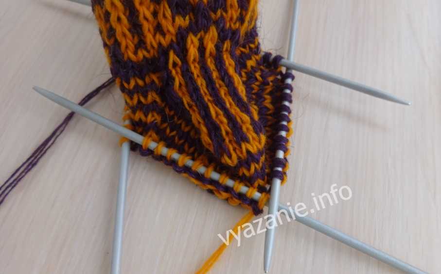 Спицей с петлями пятки (6) набрать и провязать лицевыми 8 петель вдоль бокового края стенки пятки (спица 1).