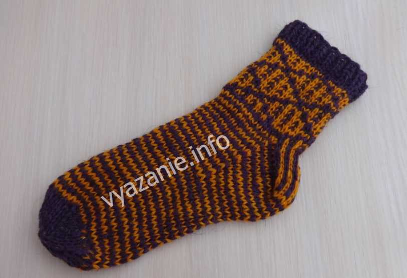 Продолжаем вязать круговыми рядами, выполняя узор «ложная» коса на верхней панели носка, а на нижней — согласно схеме № 1 лицевая гладь до необходимой длины.