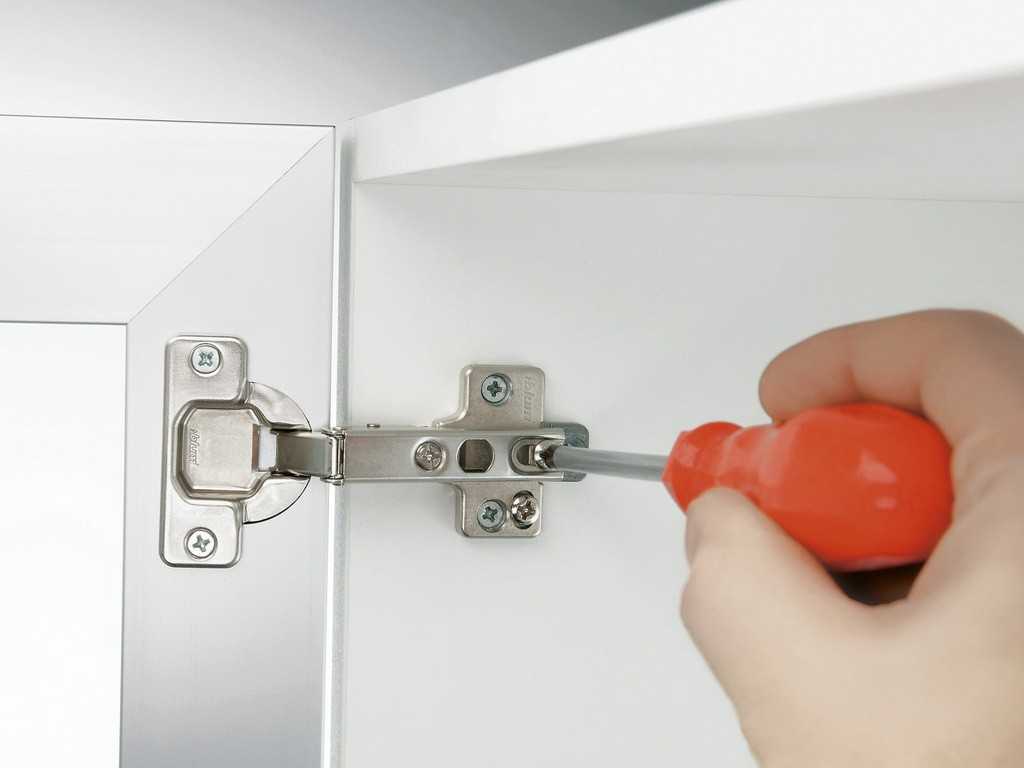 Корректировка (или регулировка) – итоговая стадия монтажа мебельных петель. Ее необходимо выполнить сразу в нескольких плоскостях – по вертикальной, по горизонтальной стороне, и в отношении глубины: