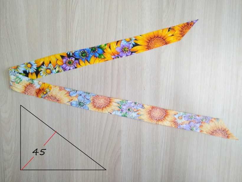 Косую бейку выкраивают под углом 45 градусов к долевой нити ткани.