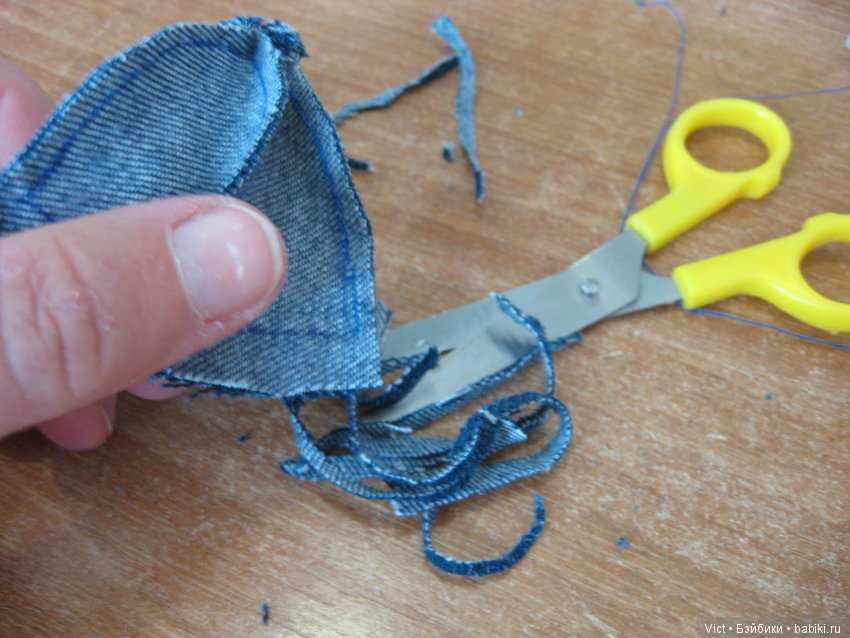 Теперь надо сшить штанишки. Нужно будет вырезать две детали. Затем вы их сошьете между собой и обработаете прорези зигзагообразными ножницами.