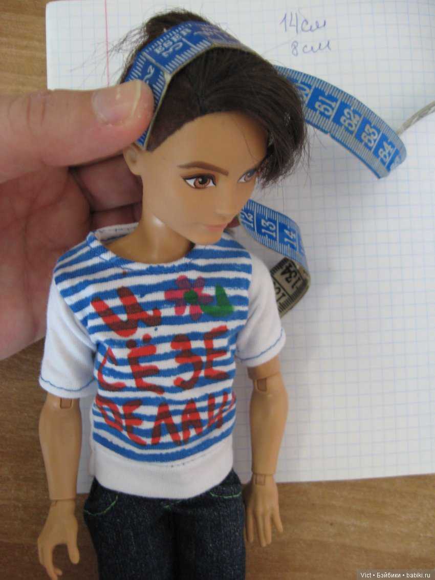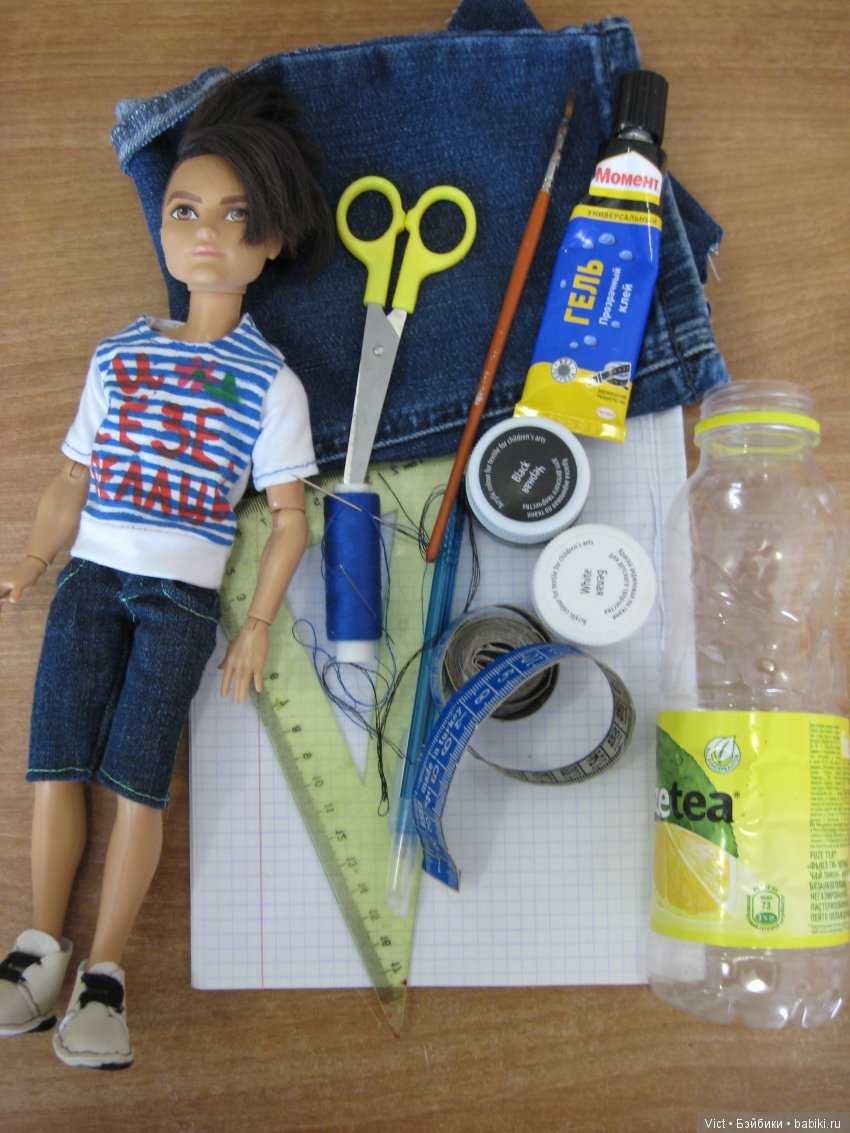 Положите куклу на лоскуток ткани, наметьте места для пройм, вырежьте дырочки, добавьте поясок — готово! Для создания новых брюк всё же понадобится машинка или нитка с иглой, плюс — около 15 минут свободного времени. Но с выкройкой тоже не придётся возиться: положите куклу на ткань, обведите — и готово.