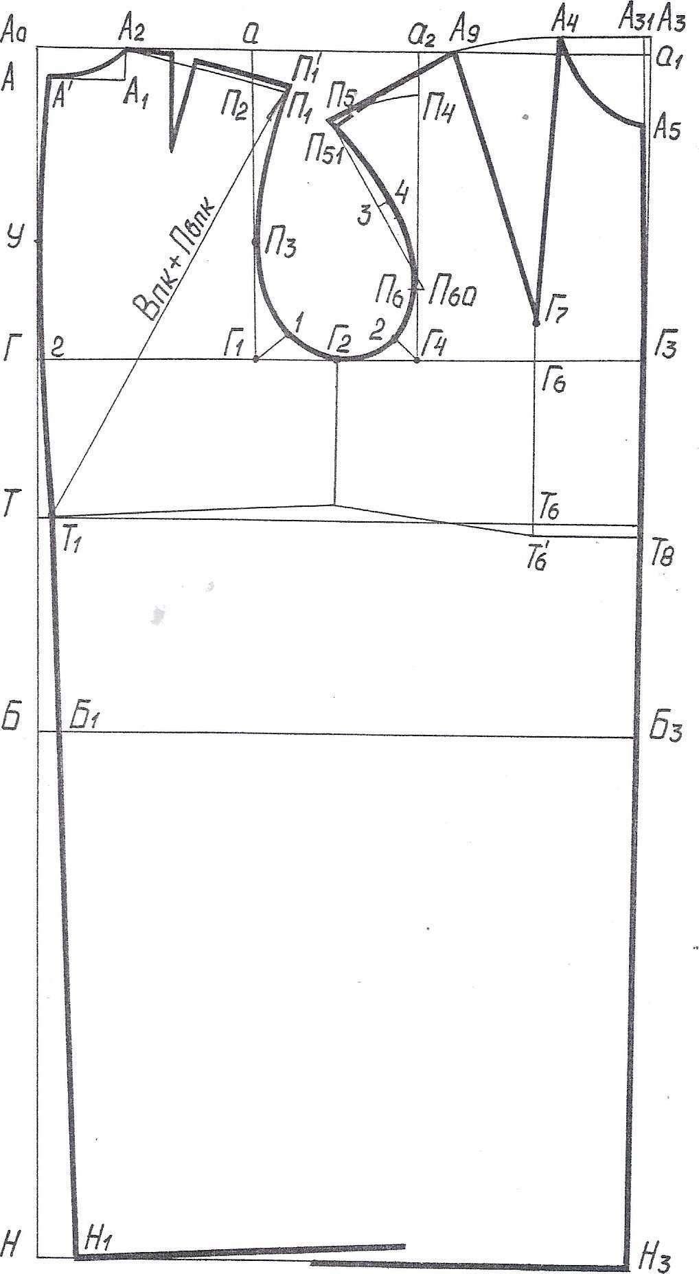 иН . При раскрое эта деталь – чертеж спинки. Затем переснимаем на кальку деталь переда с точкамиВ2, В1, А1, А2, Г1, Г4, Г2, Т3, Н3, Н4, Н .