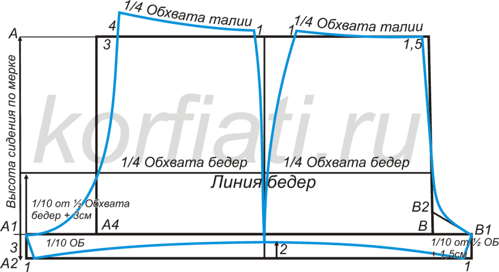 Затем от В1 проводится горизонтальная линия, равная четверти объема бедер за вычетом 1,5 см. Ставится точка Б, от которой чертится вертикаль с конечной Б1, находящейся на одной горизонтали с Т. Получается прямоугольник Т-В1-Б-Б1. От Б1 вниз откладывается высота бедер, ставится точка Б2.