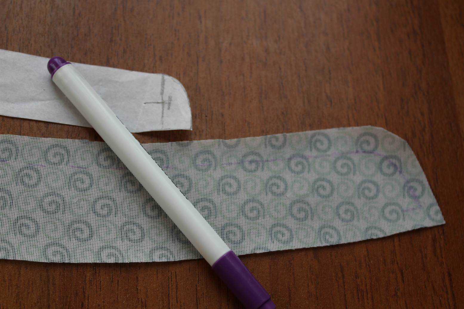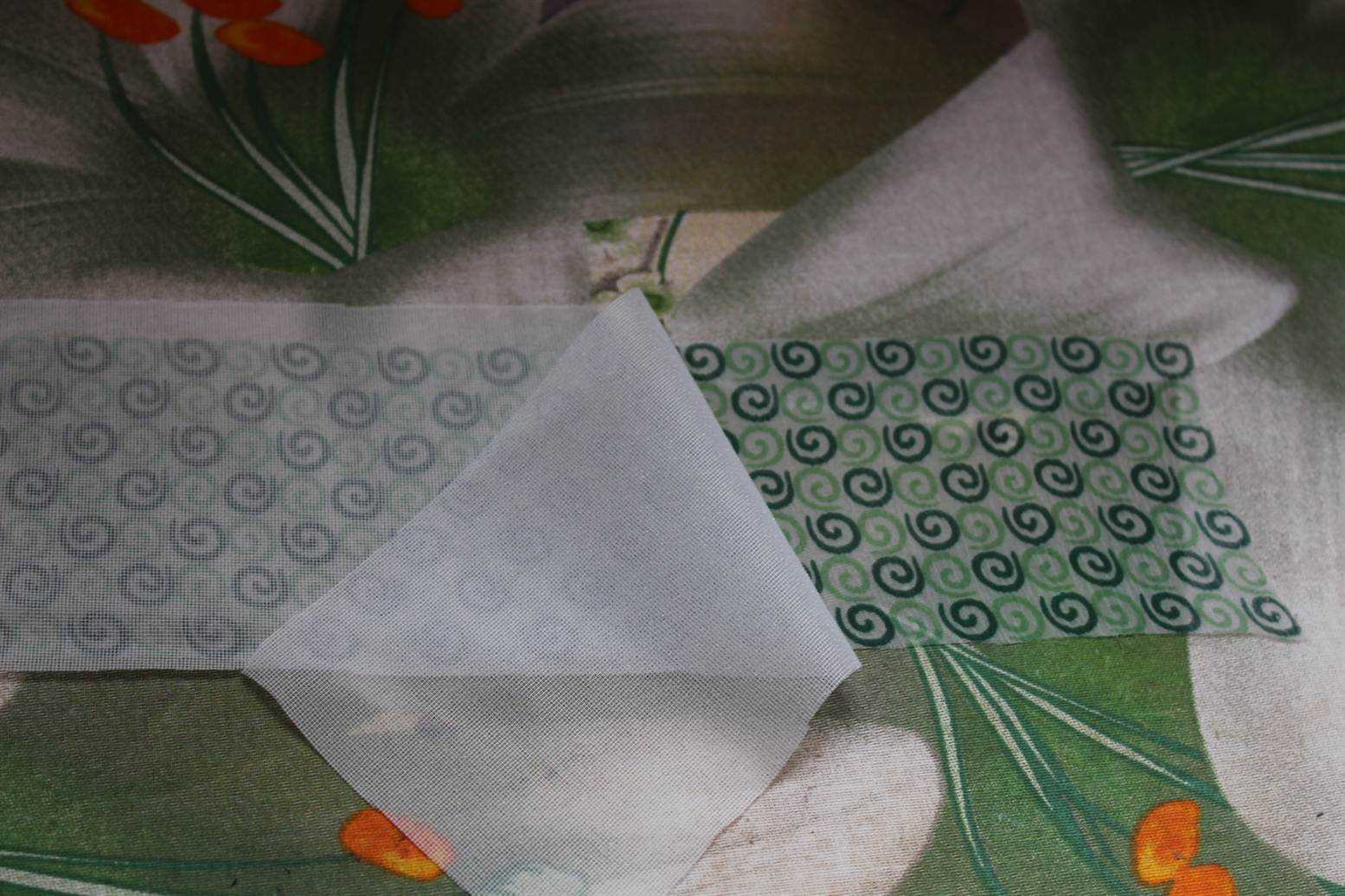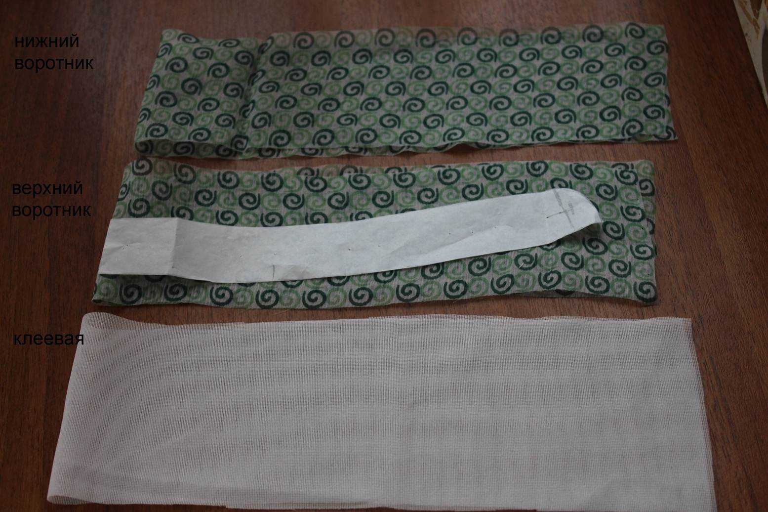 Раскроите из материала 2 одинаковых полосы, соответствующих длине воротника с припуском на швы 1,5-2 см. Продублируйте раскрой на клеевой основе.