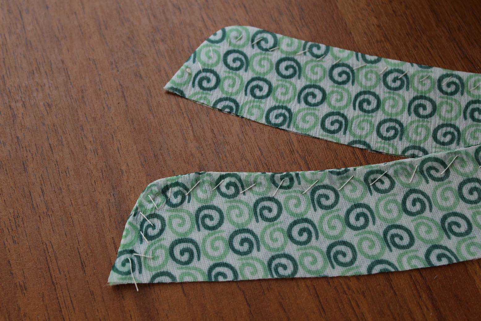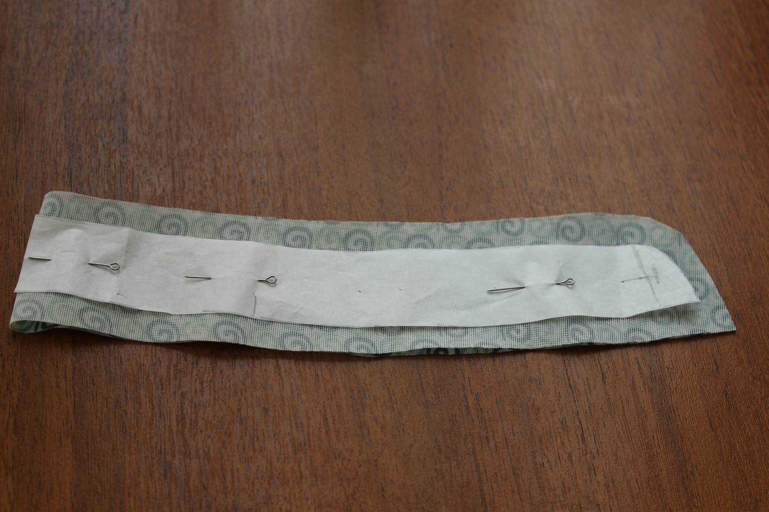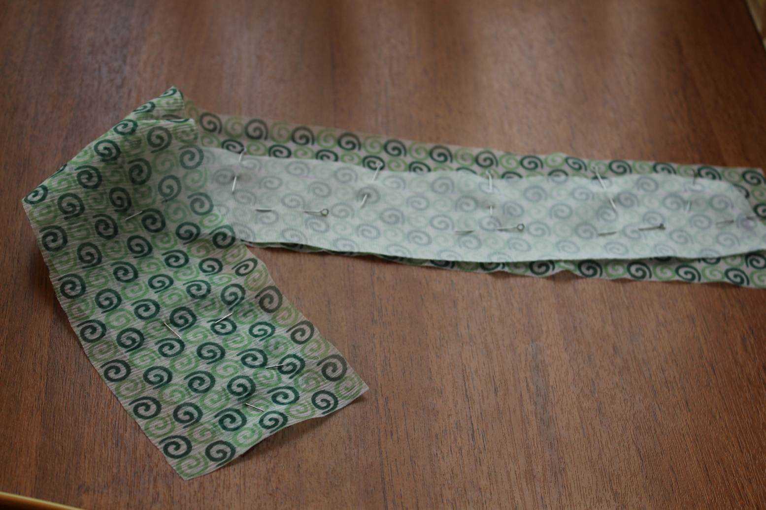 - Выложить заготовки воротника-стойки на стол лицом к лицу, после чего сколите их булавками.