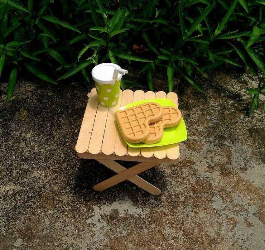 Здесь автор использовал палочки для мороженого , с ними легко работать. Более того, они придают красивый стильный вид всему, что вы делаете! Если хотите, можете использовать цветные палочки, чтобы сделать кукольный стол более ярким.