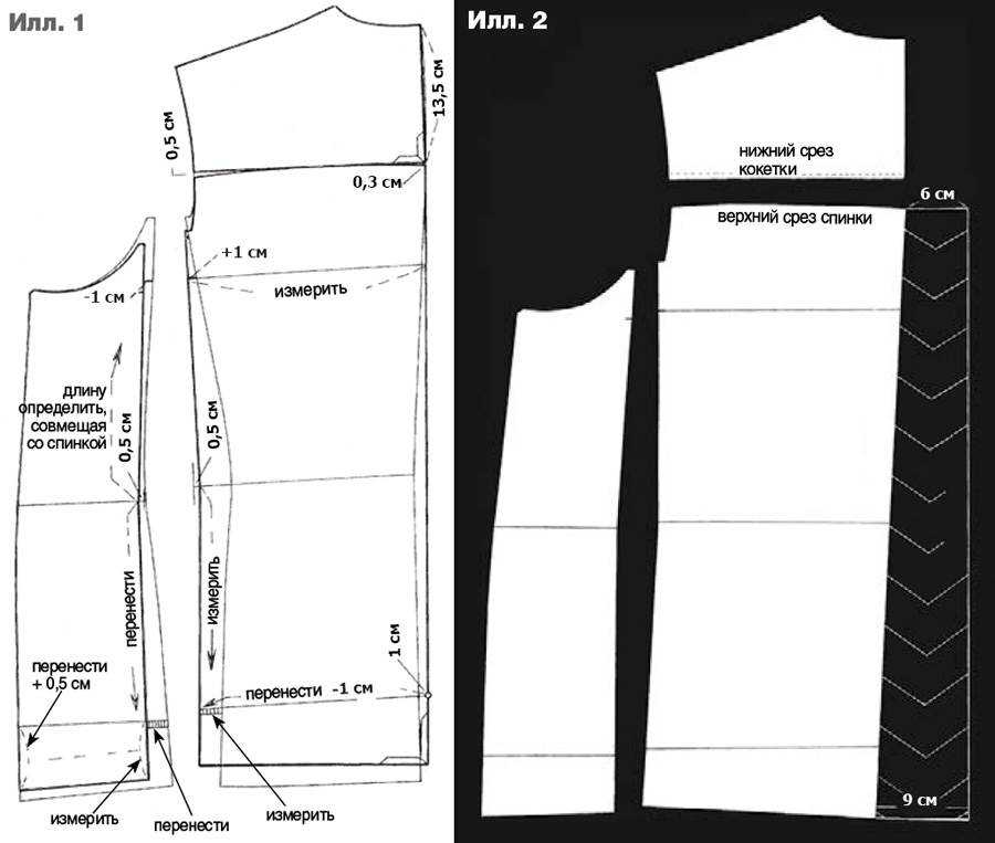 1. Для изменения силуэтной формы пиджака надо расширить спинку пиджака. По линии бедер отложить вправо от середины базовой конструкции спинки 1 см и начертить через полученную точку новую середину спинки, как показано на чертеже (илл. 1). От точки основания горловины отложить вниз длину спинки по середине. Пиджак свободной формы, как правило на 2-4 см короче пиджака прилегающего силуэта.