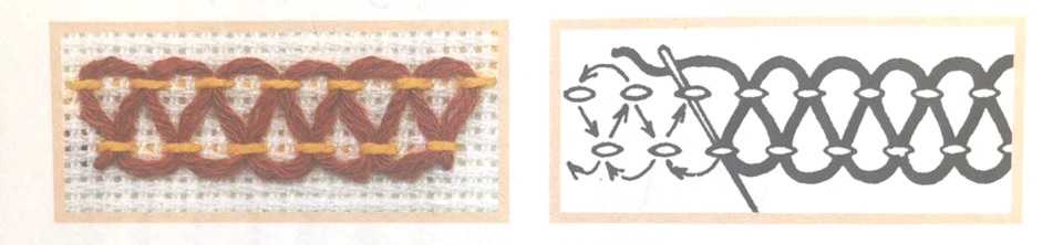 Применяют для обметывания ручных петель, а также при декоративном оформлении каких-либо деталей, салфеток, одеял. Составляют петельную строчку. Размер стежка определяет дизайнер. При выметывании петель частота стежков 6-10 на каждые 10 мм, ширина 2-3 мм.