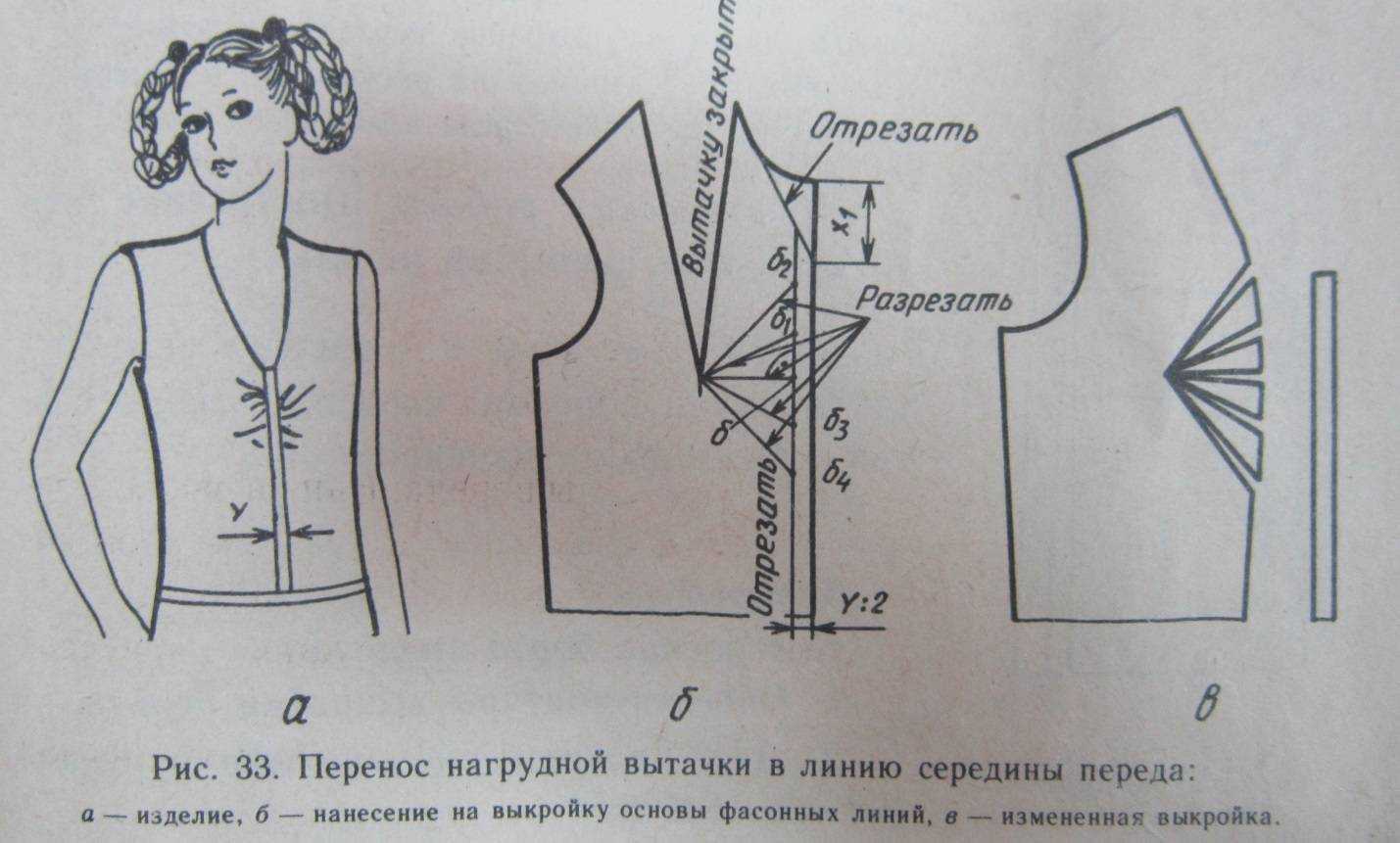 Для перевода к середине переда находят точку на 2 см ниже линии груди и точку середины переда, после чего соединяют эти две точки. Полученная линия будет показывать направление шва. Затем соединяют центр на груди и центр на талии. По полученным линиям делаются разрезы, и основа совмещается. Раствор, который был получен, закладывается в направлении пояса, после чего линия середины переда выравнивается. Угол уклона шва зависит от величины груди и размеров талии, и для точности может быть намечен на фигуре.